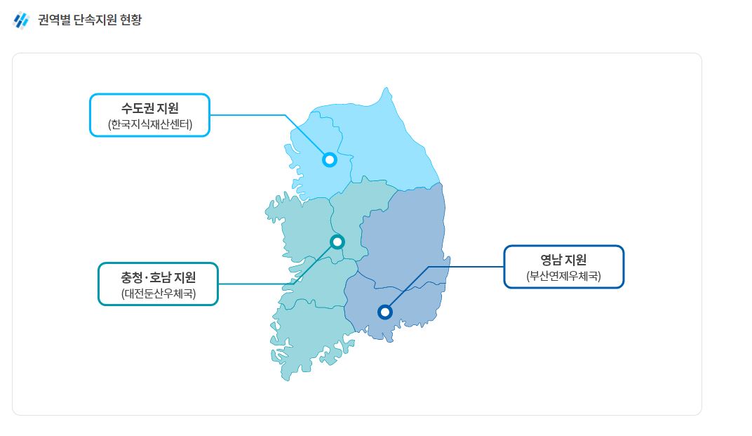 한국지식재산보호원은 전국에 세곳의 권역별 단속지원 본부?를 두고 있습니다. 센터가 수도권에 한 곳이 있고, 충청호남지원영남지원에 각각 한개씩 있으며 충청호남은 대전둔산우체국, 영남은 부산연제우체국에서 지원하고 있습니다. 우체국에서 한국지식재산보호원 업무를 하는 이유는 잘 모르겠습니다.