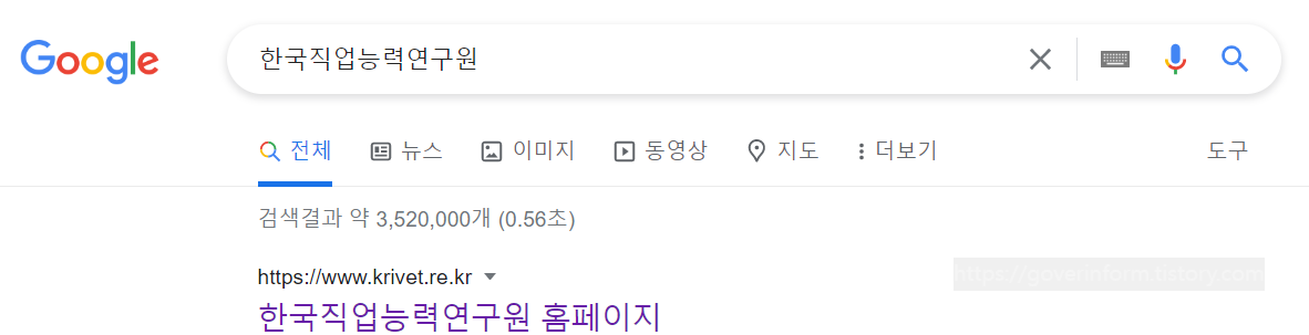 한국직업능력연구원 홈페이지는 포털검색창에 한국직업능력연구원을 입력하고 검색하면 상단에 주소가 나옵니다. 상단 주소로 접속하면 홈페이지에 접속할 수 있습니다. 또는 영문으로 되어있는 url을 통해 접속할수도 있습니다.