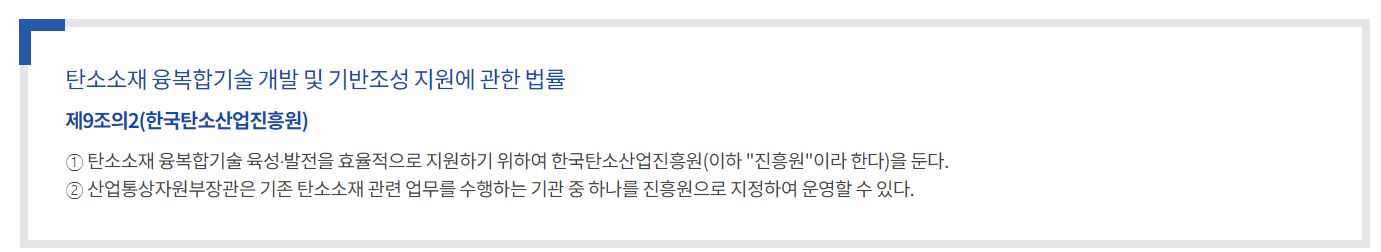한국탄소산업진흥원은 탄소소재 기술 산업 육성 및 지원 사업 수행을 하여 탄소산업 조성 및 확산으로 국가산업 고도화를 목적으로 설립하였으며 이와 관련한 조항에는 탄소소재 융복합기술개발 및 기반조성 지원에 관한 법률 제9조에 명시되어 있습니다.