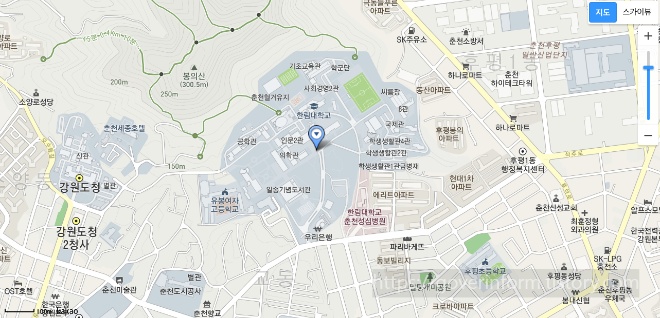 한림대 캠퍼스 위치는 아래와 같습니다. 전철을 이용하는 경우, 춘천역(한림대)과 가까우며 자가용 이용시 서울 강동구 하일동 기준으로 경춘고속도로를 타고 약 40분 소요됩니다. 한림대 학교 찾는 방법은 아래 한림대 찾아가는길 전체보기를 하면 상세하게 볼 수 있습니다. 자가용/시외버스/전철/지역별(부산,대구,포항 지역, 동해안지역, 경기도, 충청북도, 전라도) 한림대 빠르게 가는길을 자세하게 알려주고 있습니다. 굳이 알아보지않아도 한림대 홈페이지에서 제공하는 찾아가는길을 살펴보면 쉽게 찾아갈수 있습니다^^