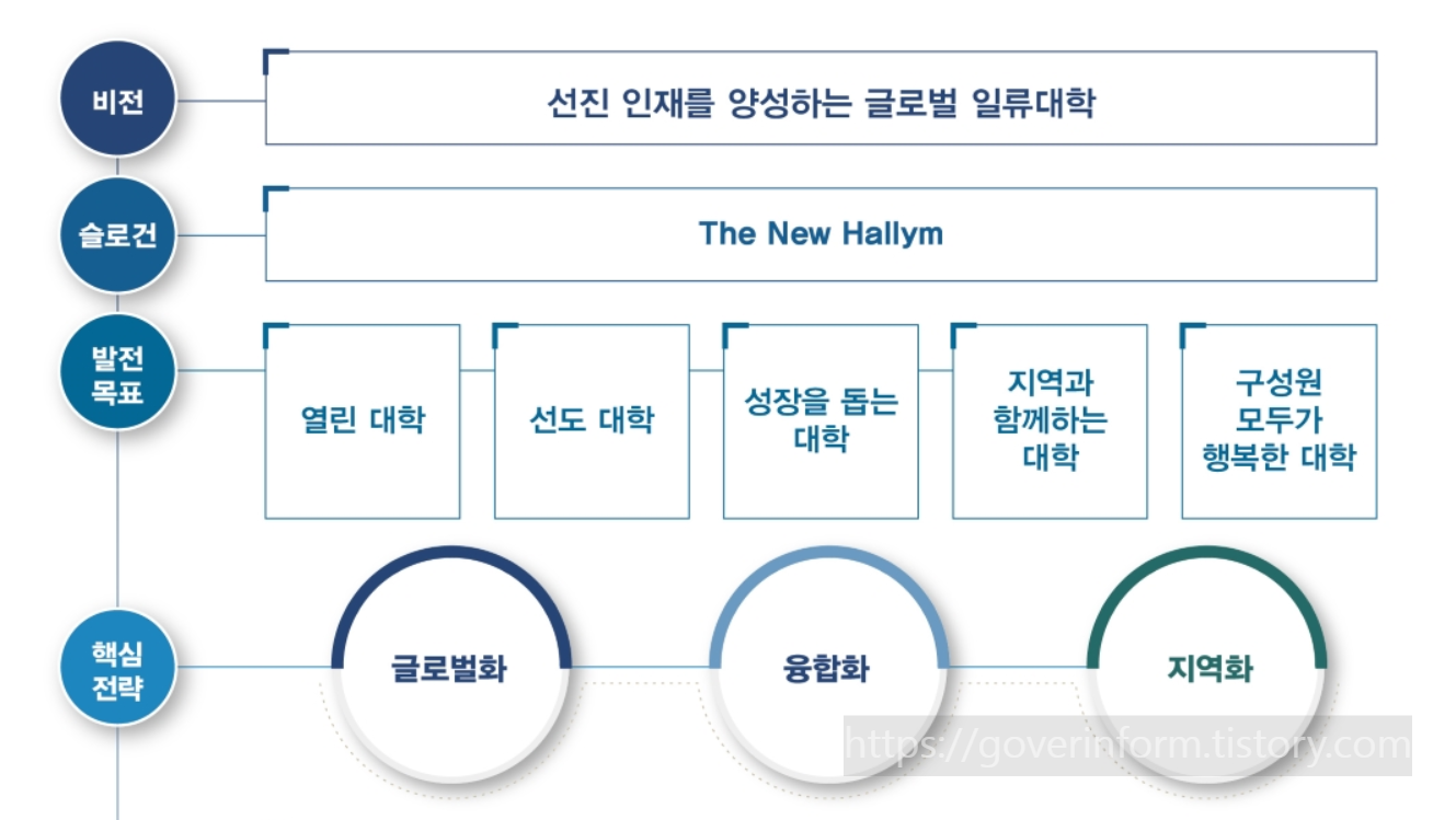한림대는 강원도 춘천시 한림대학길 1에 위치하고 있으며, 4년제 대학입니다. 먼저 한림대 비전과 목표를 살펴보시죠. ㅎㅎㅎ 한림대의 비전은 선진 인재 양상을 하는 글로벌 대학으로, 열린대학, 선도대학, 성장을 돕는 대학, 지역과 함께 하는 대학, 구성원 모두가 행복한 대학을 지향합니다.