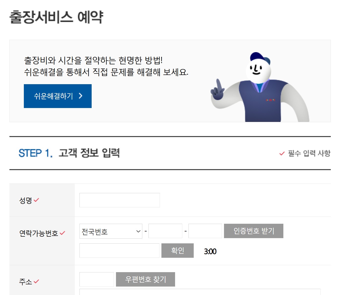 출장서비스 방문시간 안내는 방문일 오전 08시 ~ 09시에 안내드립니다. 부득이한 경우, 출장예약 일정이 변경될 수 있음을 양해 부탁드립니다.