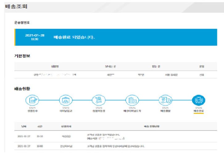 4) 기본정보에는 상품명 보내는 분 받는 분 운임과 배송현황 실시간 위치가 나옵니다.
