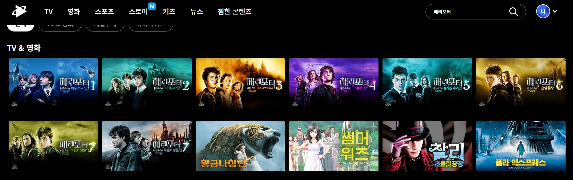4. 아래처럼 해리포터 1 부터 8 시리즈까지 나옵니다. 와우에 가입되어있으면 시리즈 모두 볼 수 있습니다. 넷플릭스나, 왓차 등에는 해리포터 시리즈가 없습니다.