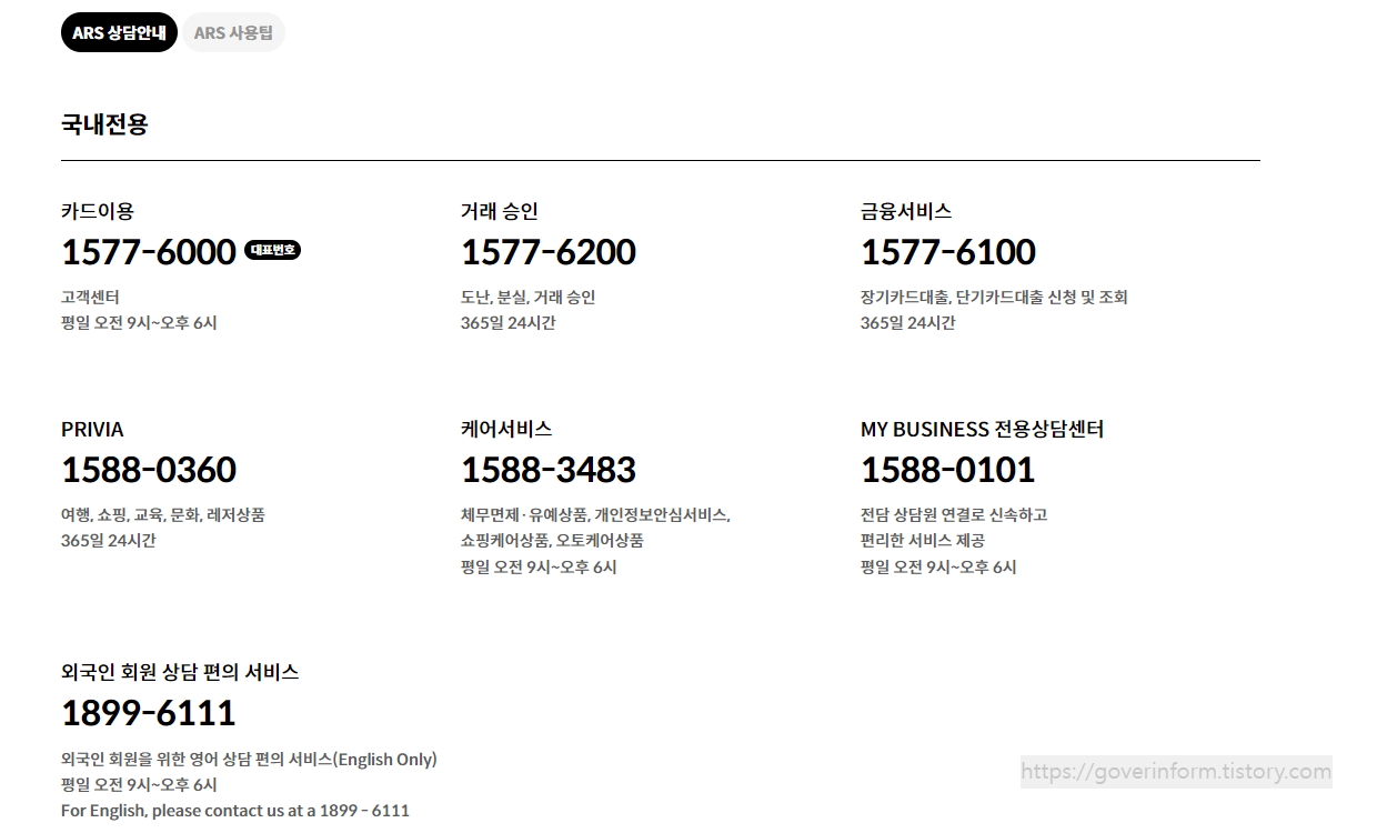 다음은 ARS 이용방법이다. ARS는 카드이용, 거래승인, 금융서비스, PRIVIA, 케어서비스, MY BUSINEES 전용상담센터, 외국인 상담으로 전화번호가 구분이 되어있다. 해당 번호로 전화를 걸어 상담원연결을 하면 된다.