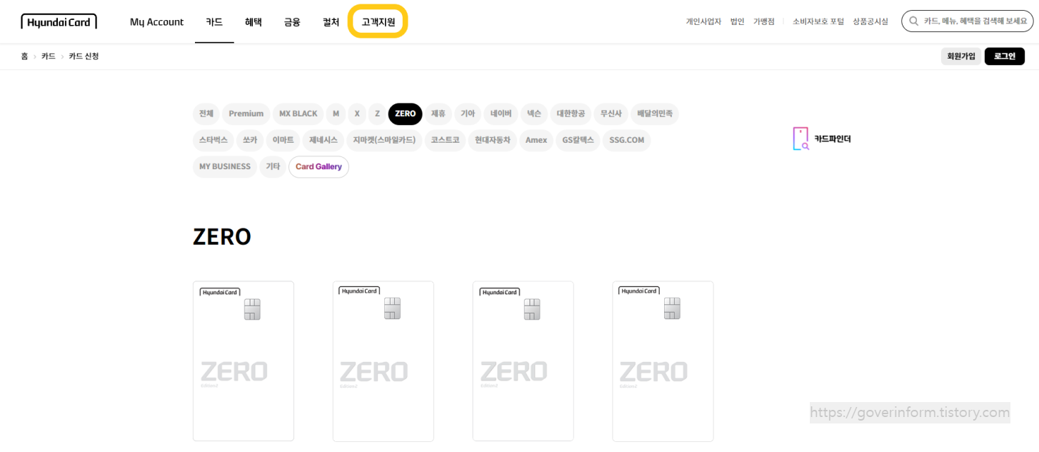 현대카드 고객센터 홈페이지에 접속하면 다음처럼 첫화면이 나온다. 첫화면 상단에 보면 고객지원이라고 쓰여있는 부분이 있다. 여기에 가면 고객센터를 이용할수 있다.
