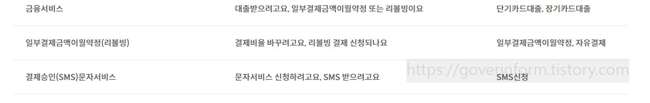 고객센터 대표 전화번호에 전화를 걸면 말로 하는 ARS 또는 누르는 ARS를 선택하게끔 되어있습니다. 말로 하는 ARS의 경우 아래 예시표를 보고 이용하고자하는 서비스를 음성으로 하면 바로 원하는 서비스 메뉴로 연결해줍니다.