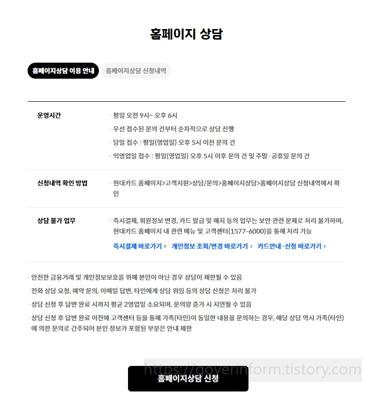 현대카드 홈페이지>고객지원>홈페이지상담에 가면 이용안내가 되어있습니다. 평일 오전 9-6시까지 이용가능하며 순차적 상담을 진행합니다. 평일 오후 5시 이후에 상담 내용을 입력할 경우 다음날 답변을 받을수 있습니다.