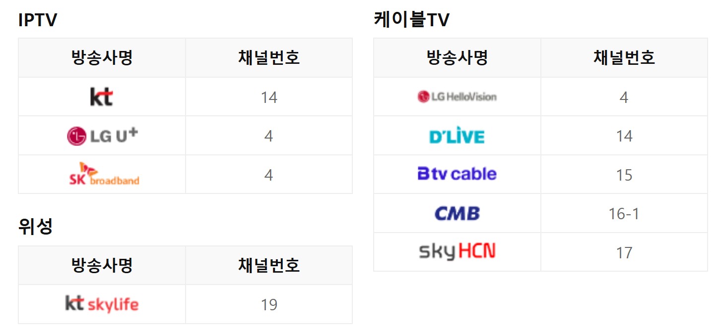 방송사마다 채널정보는 달라질 수 있어요~! 케이블 티브이는 대표 채널 기준으로 지역마다 채널이 상이할 수 있는 점 유의하세요~!^^