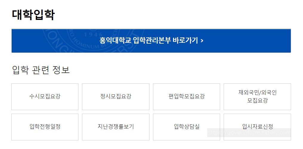 홍익대 입학처 홈페이지 첫화면은 다음과 같습니다.