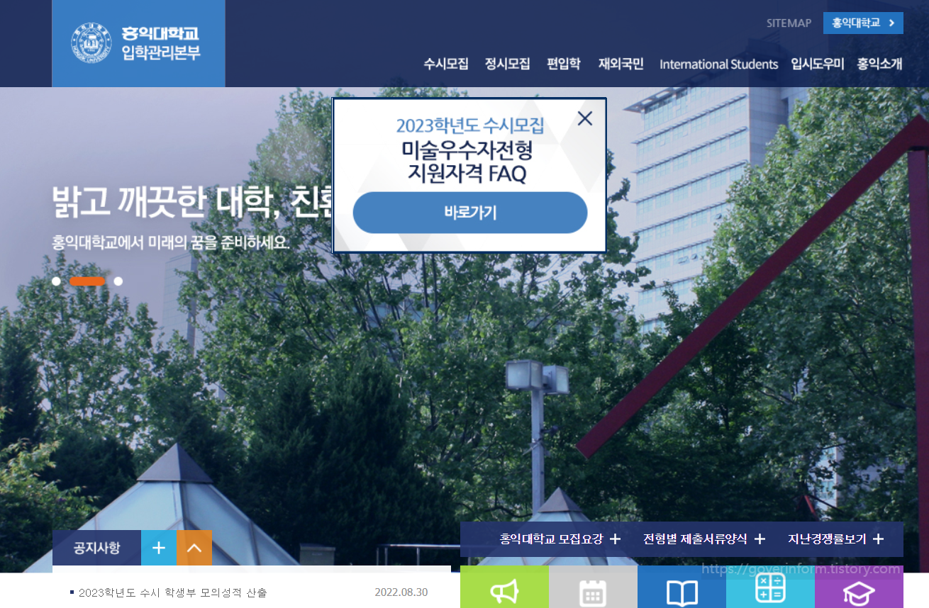 홍익대학교 입학처 홈페이지 바로가기