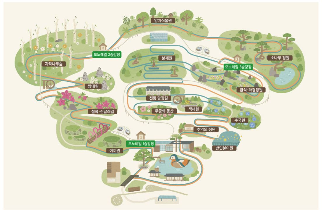 화담숲 모노레일은 안전한 관람을 위해 노약자를 위하여 운행 중이며 전체 운영 소요시간은 20분이며 1,213m 순환선입니다. 모노레인 구간별 이용요금은 다릅니다. 모노레일 1>2승 강장 성인, 경로, 청소년 5,000원 / 어린이 4,000원 모노레일 1>3승 강장 성인, 경로, 청소년 7,000원 / 어린이 6,000원 모노레일 1>1 승강장 성인, 경로, 청소년 7,000원 / 어린이 6,000원입니다.