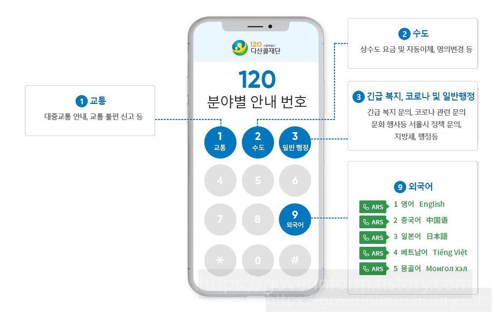전화상담 : 상담 시간은 365일 24시간 한국어로만 제공이 되고 외국어 상담은 월~금 9:00~18:00(휴일, 공휴일 제외) 농인 상담은 평일 9:00~22:00, 주말및공휴일 9:00~18:00 이고 이용 방법은 서울 시내 유선 전화로 국번 없이 120 이며 시외 및 휴대전화로 이용시 02-120(02-731-2120) 해외는 82-2-731-2120 입니다. 이용 요금은 별도의 정보 이용료 없이 일반 전화 요금으로 이용 가능하고 전화 요금은 개인 전화 종류 및 요금제에 따라 다릅니다. 상담 내용은 120 다산콜센터는 교통 정보, 수도 요금, 지방세, 민원 신고, 정책 문의 등 서울특별시 25개 자치구 행정에 대한 전문적인 상담을 지공하고 서울특별시 25개 자치구청 및 보건소 대표번호는 120 다산콜센터로 연결됩니다.