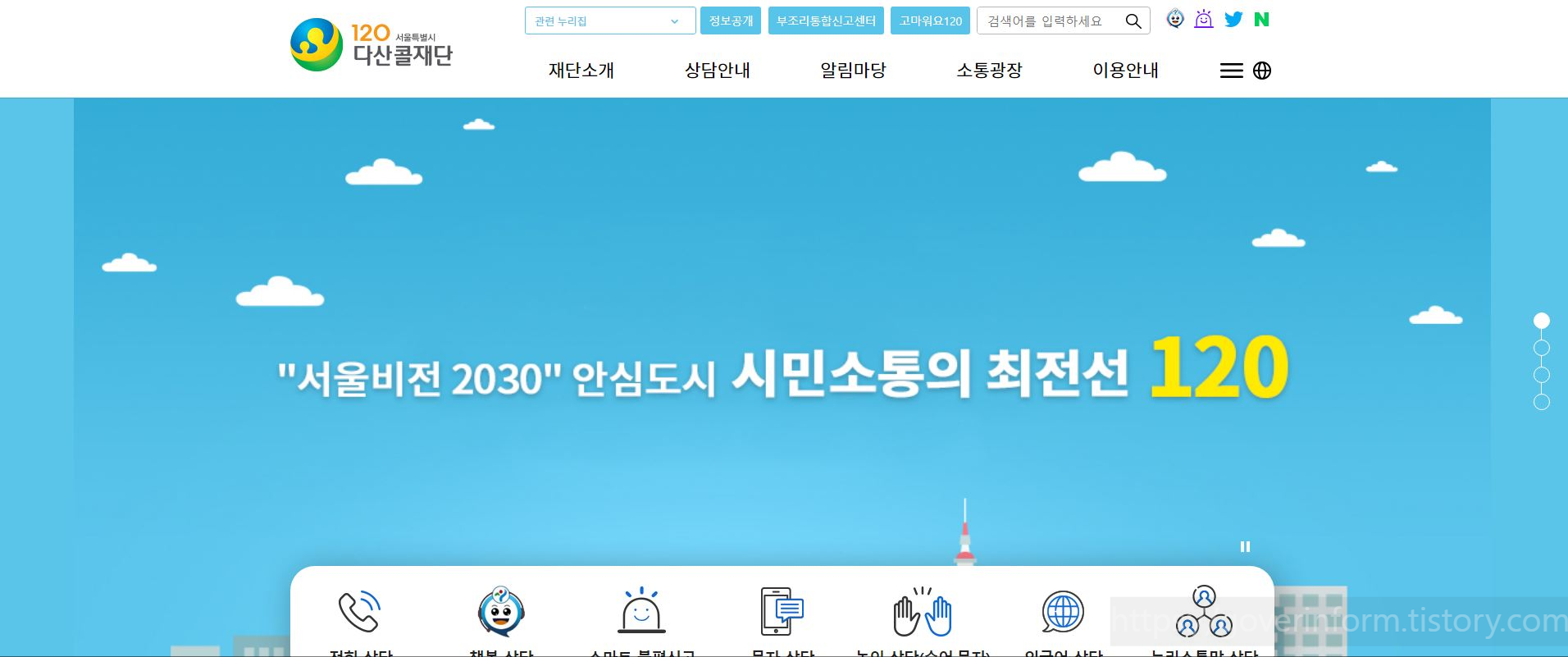 120 다산콜센터 홈페이지에 가면 하단처럼 재단소개 상담안내 알림마당 소통광장 이용안내 서비스를 제공하오니 많은 이용바랍니다.