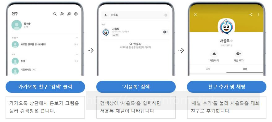 챗봇 상담 서울톡 : 인공지능 상담사가 서울시에 대한 행정 문의에 답하고 시설이나 교육 행사 등 공공 서비스 예약 및 민원접수를 도와주는 챗봇 서비스입니다. 상담 시간은 365일 24시간이고 이용방법은 카카오톡에서 서울톡을 검색하여 친구를 추가하고 이용하면 됩니다. 상담 내용은 행정안내, 현장민원 접수, 서울시 공공 서비스 예약, 도서관 서비스, 평생교육 온라인강의 수강신청 서비스 입니다.