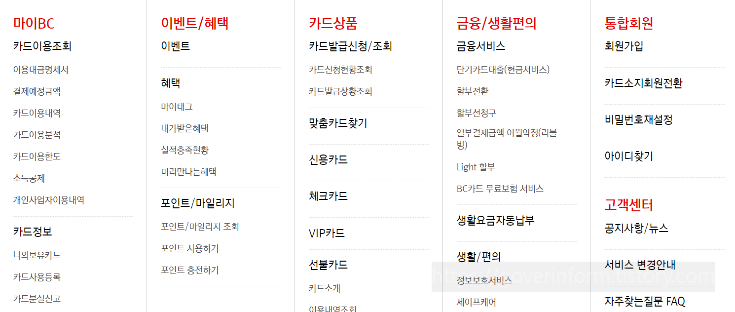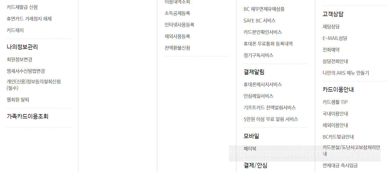 메뉴 전체보기를 보면 다음처럼 BC카드 홈페이지에서 이용할수 있는 서비스 목록을 볼수 있습니다. 기본적인 카드사 제공서비스인 이용대금명세서 조회, 결제예정금액, 카드이용내역, 카드이용분석, 카드이용한도 조회, 소득공제, 이벤트, 카드 신청현황조회, 카드 발급상황조회, 신용카드, 체크카드찾기 등 다양한 서비스가 있습니다.