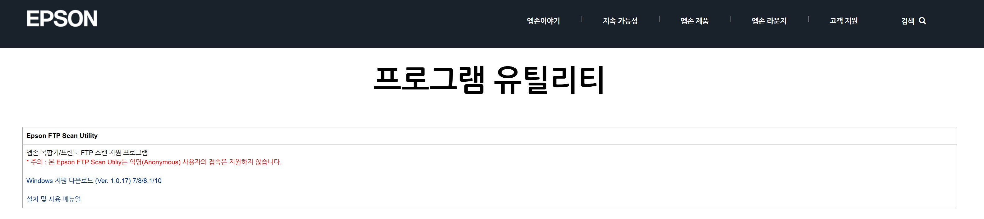 지금부터 Epson FTP Scan Utility 다운로드 방법에 대해 알아보고자 합니다. 먼저 Epson 홈페이지에 접속을 해야 합니다. www.epson.co.kr 이 링크로 접속해도 되고 직접 검색해서 접속을 해도 됩니다. 그리고 나서 프로그램 유틸리티라는 메뉴를 찾아야 하는데 여간 찾기 쉬운 게 아니라 여기에서 바로 이용할 수 있는 링크를 알려드립니다.