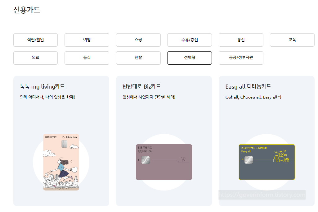 KB국민카드 추천이나 종류를 알고 싶은분들 혹은 나의 생활패턴에 맞는 KB국민카드가 궁금한 분들은 홈페이지에서 확인할수도 있습니다. 신용카드, 체크카드도 추천해주고 혜택별로 (적립/할인, 여행, 쇼핑, 주유/충전, 통신, 교육, 의료, 음식, 렌탈, 선택형, 공공/정부지원) 원하는 카드를 찾을수도 있습니다.