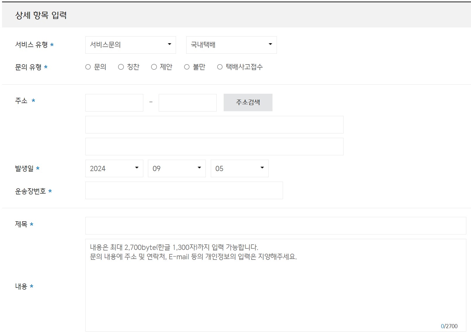 서비스 유형, 문의 유형, 주소, 발생일, 운송장 전호와 제목 그리고 내용을 작성합니다.