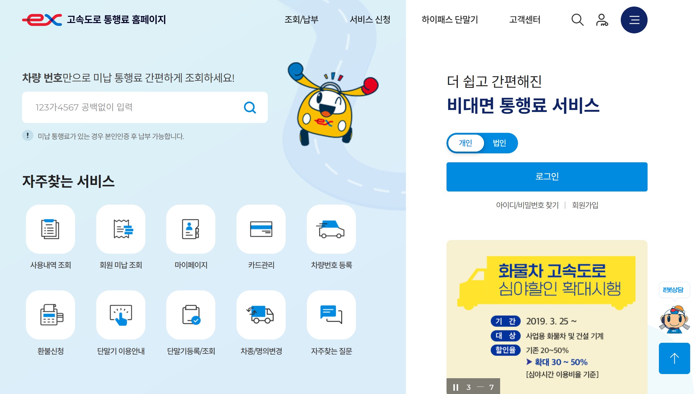 차량 번호만으로 미납 통행료 간편하게 조회하세요! 미납 통행료가 있는 경우 본인인증 후 납부 가능합니다.