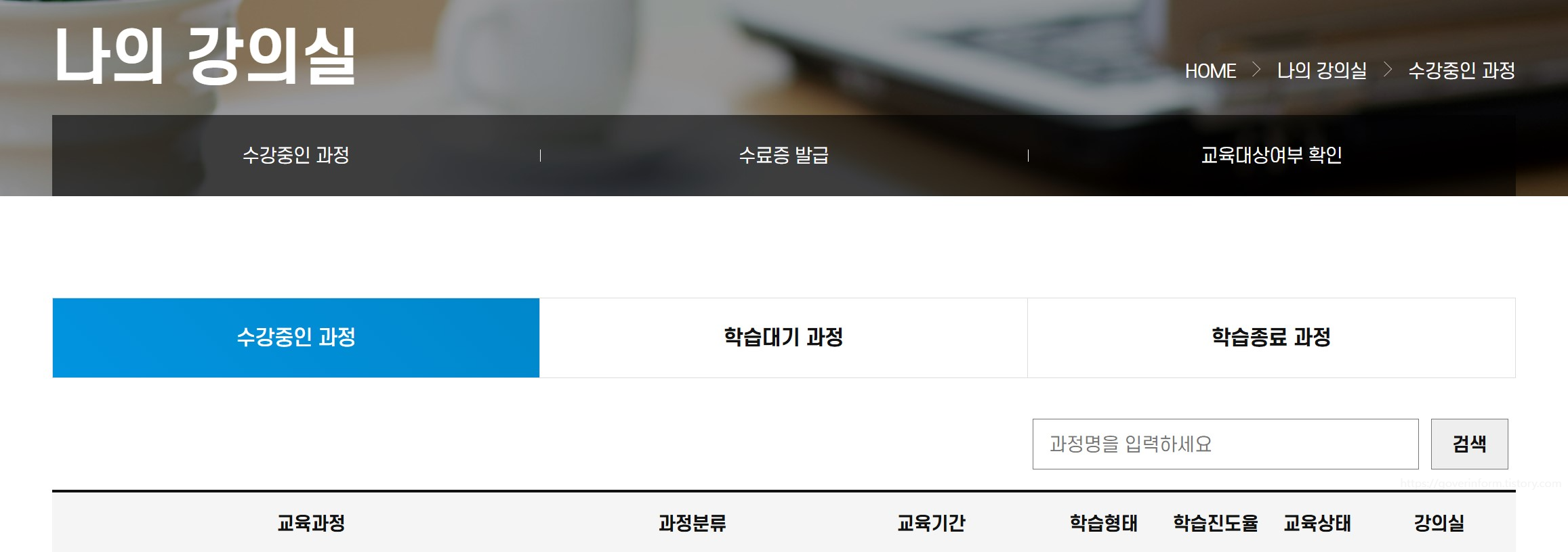 수강 신청 후에는 나의 강의실에서 학습을 진행할 수 있다. 각 과정은 진도율과 평가를 통해 수료 여부가 결정되며, 수료 기준을 충족하면 수료증을 발급받을 수 있다. 수료증은 향후 경력 관리나 자격증 취득 시 유용하게 활용될 수 있다.
