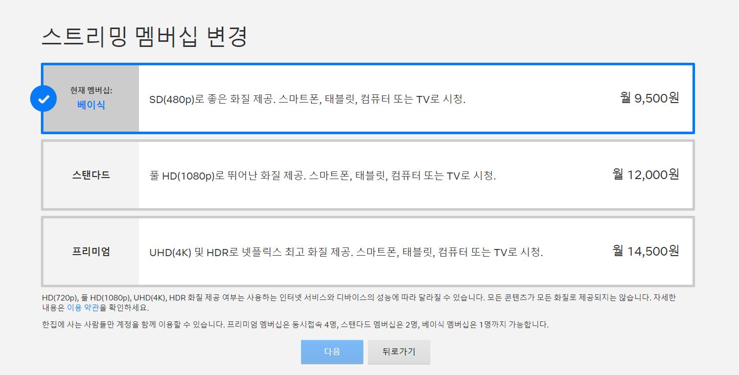 넷플릭스 요금제입니다. 저는 베이직으로 가입했는데 스탠다드 프리미엄도 있습니다.