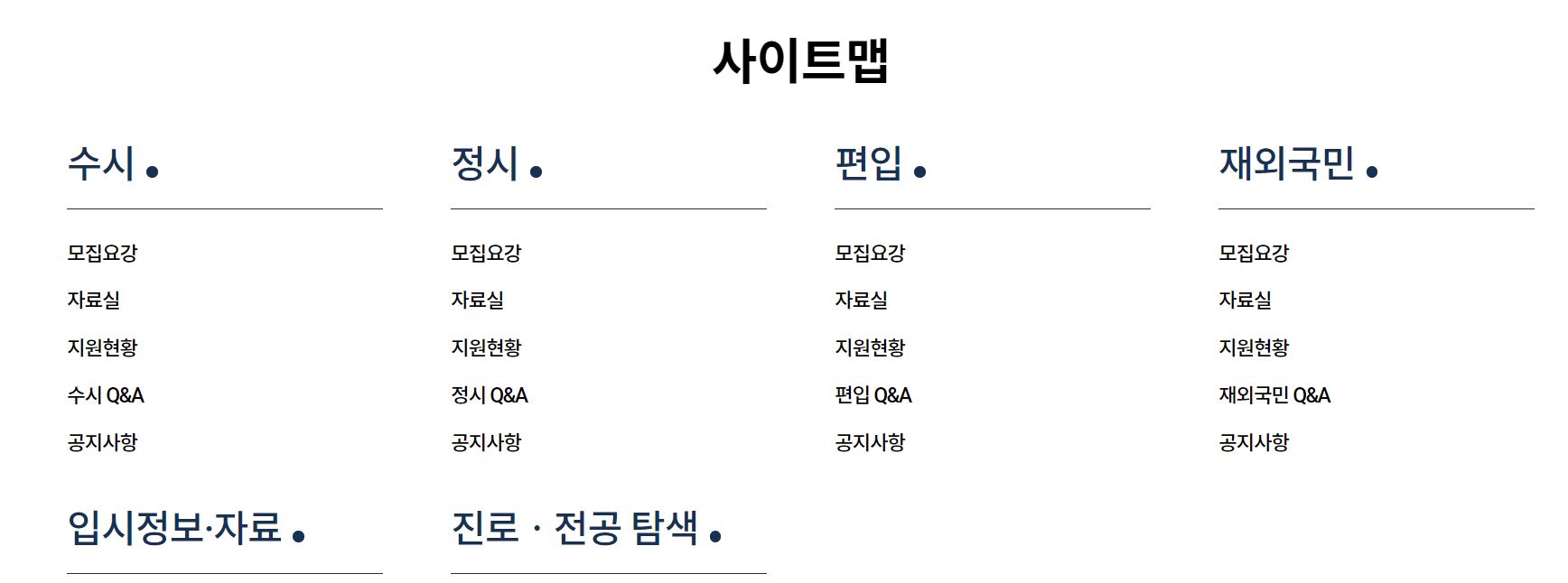 아래와 같은 정보가 있습니다. 수시 정시 편입학 모집요강 자료실 지원현황 등이 있습니다.