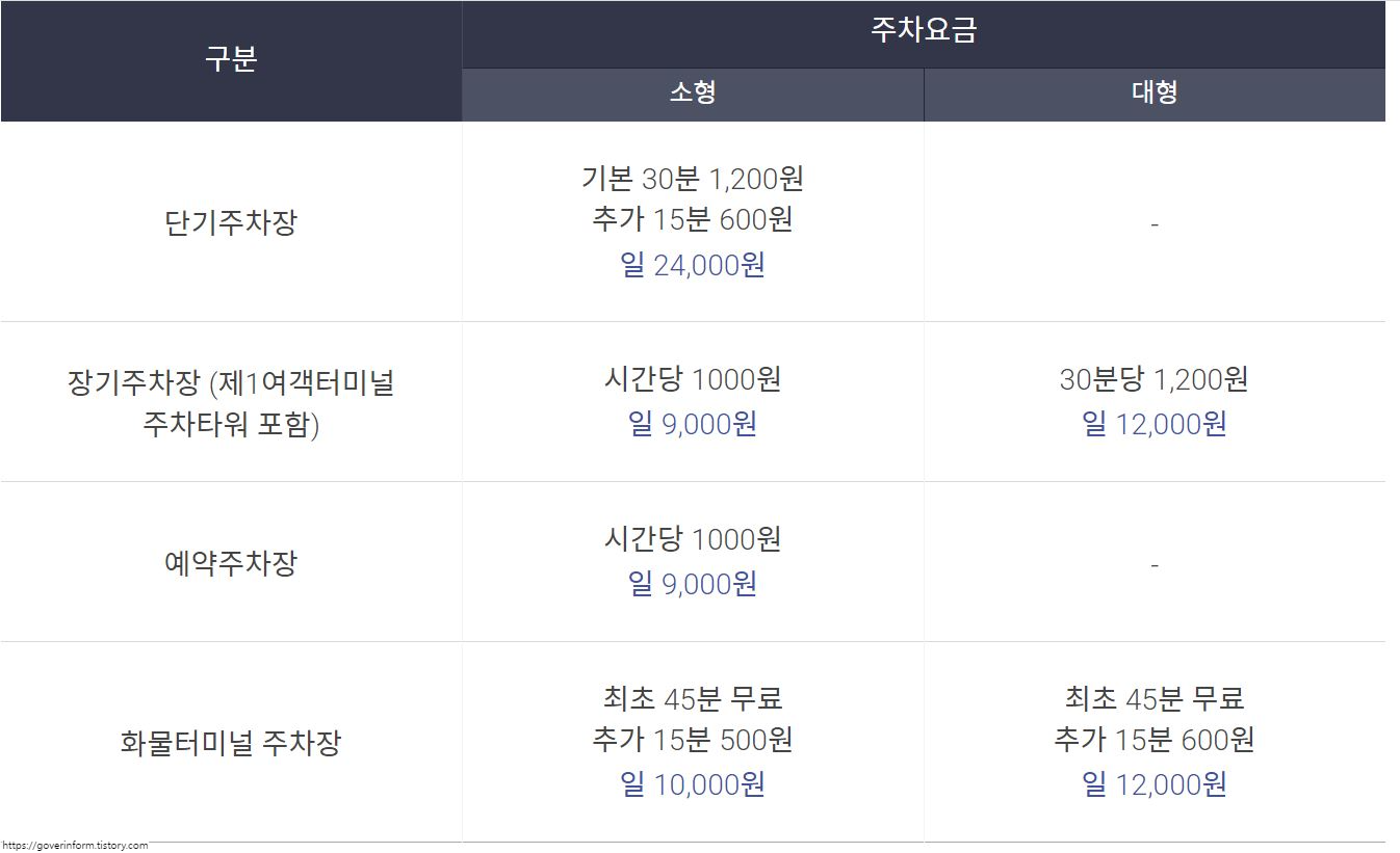 4) 화물터미널 주차장 최초 45분 무료 추가 15분 500원 일 10,000원(소형) 최초 45분 무료 추가 15분 600원 일 12,000원(대형)